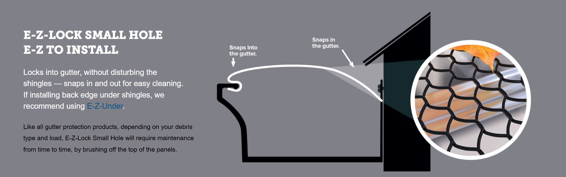 Snaps directly into the front of the gutter for quick, easy installation and just as easy removal for maintenance — without disturbing the shingles. No tools required for installation or removal.